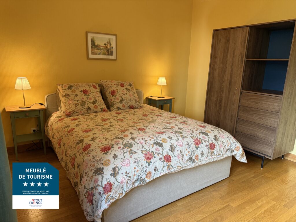 La chambre principale au calme côté jardin disposant de grands rangements, un lit de dimensions 160x200cm. Nous veillerons à ce que les lits soient faits à votre arrivée.