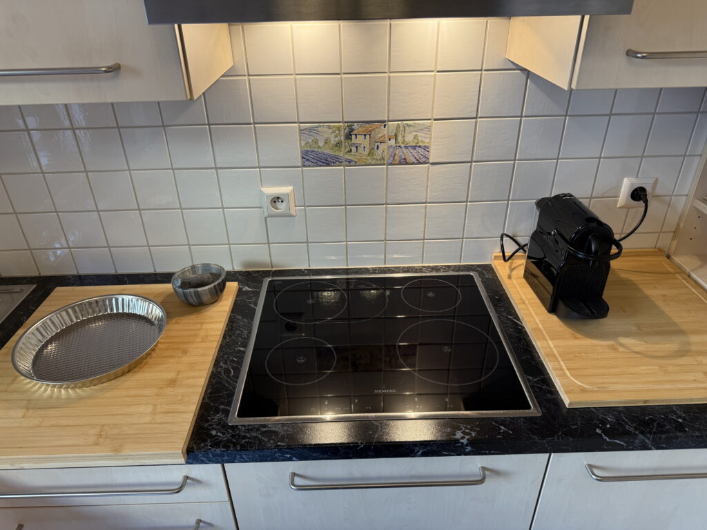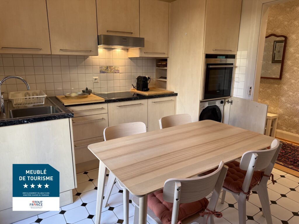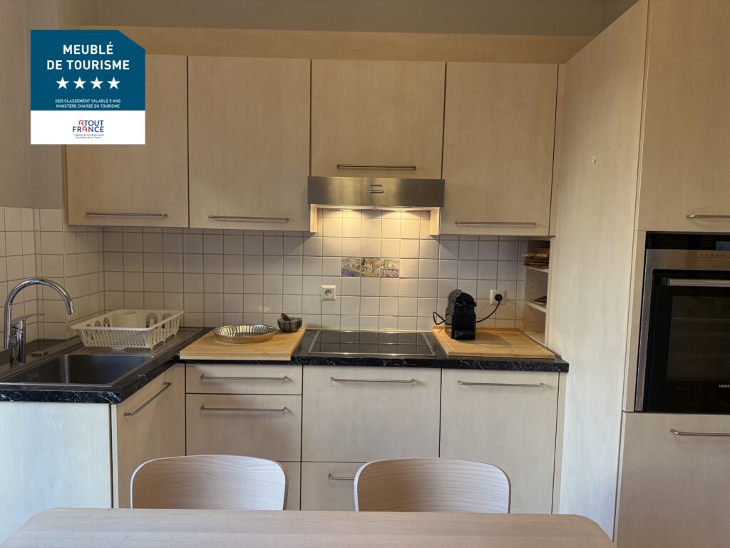 Cuisine entièrement équipée: 4 plaques à induction, hotte aspirante, four, cafetière, machine à expresso (Nespresso), bouilloire électrique, micro-ondes, grille-pain, rape électrique, lave-linge séchant, et le nécessaire de cuisine ainsi que les couverts pour préparer et partager un repas pour 4 personnes.
